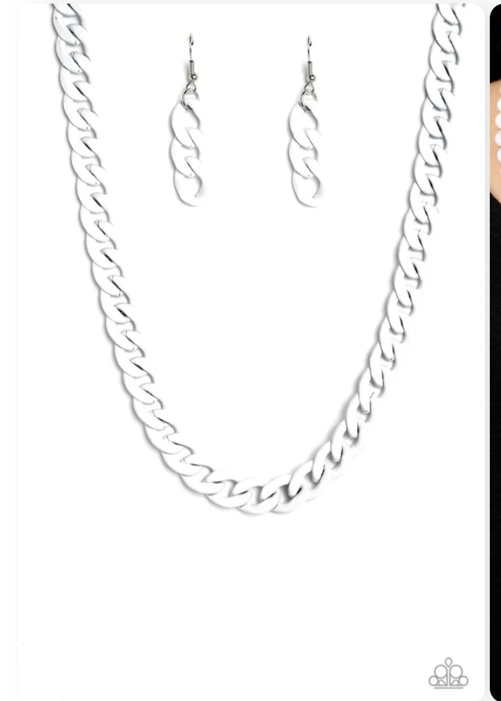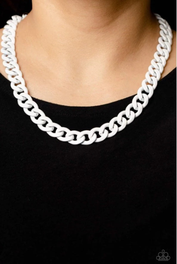 Brushed in a glossy white finish, a classic curb chain drapes across the chest for an attention-grabbing, fashionable pop of color. Features an adjustable clasp closure.