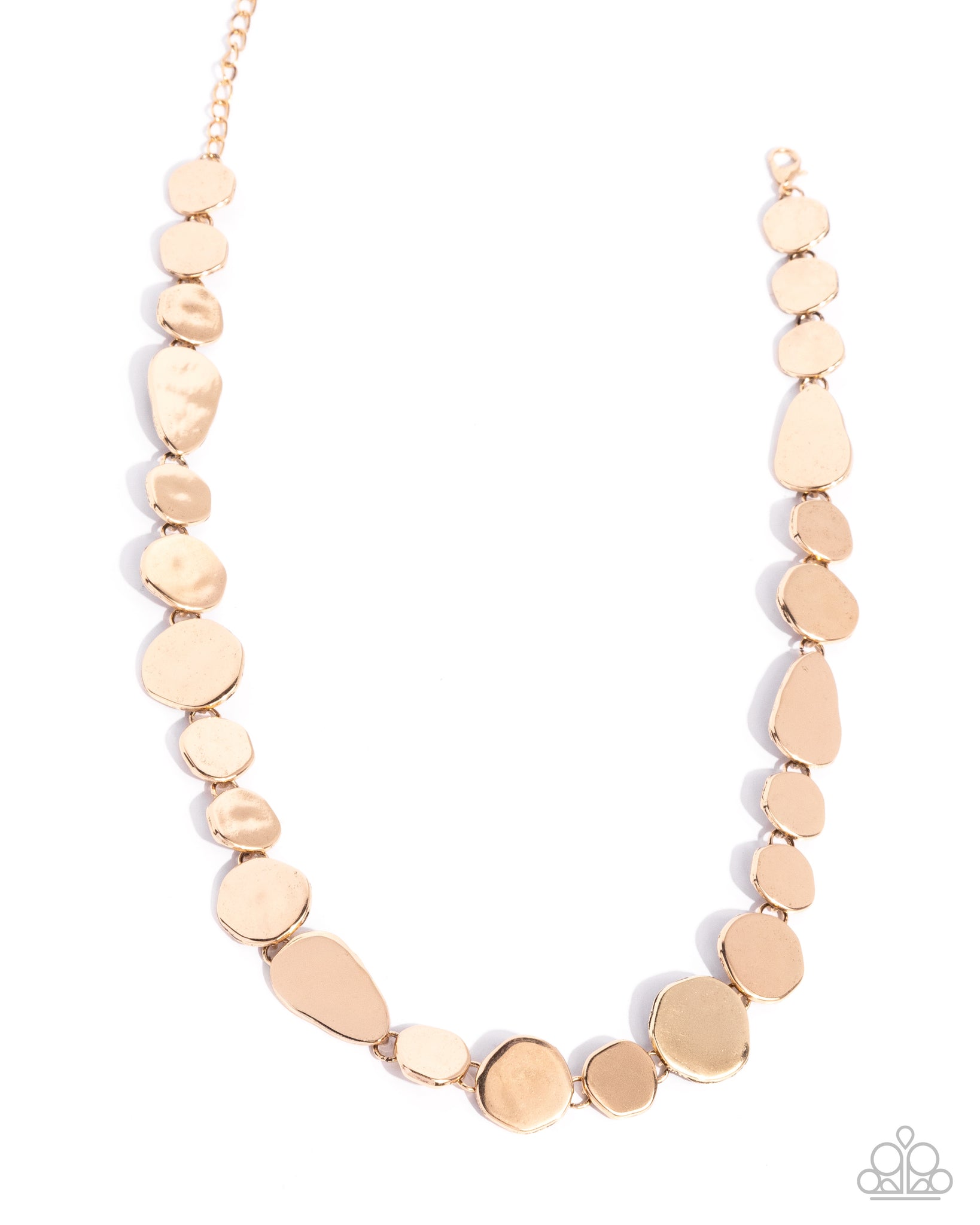 Delicately placed along a gold link chain, a collection of varying sizes of gold abstract pebbles and pendants pattern around the neckline for a monochromatic mesmerizing display. Features an adjustable clasp closure.