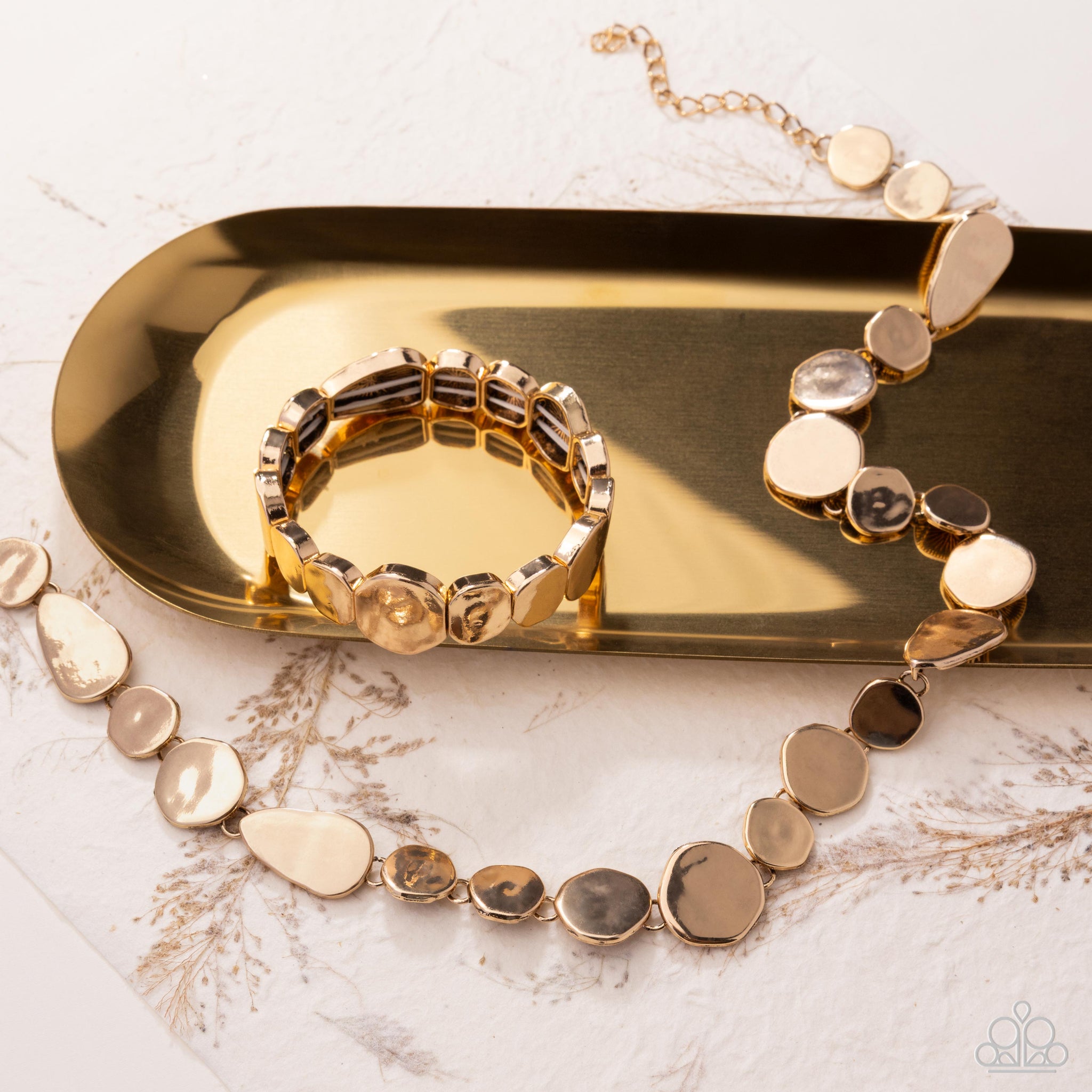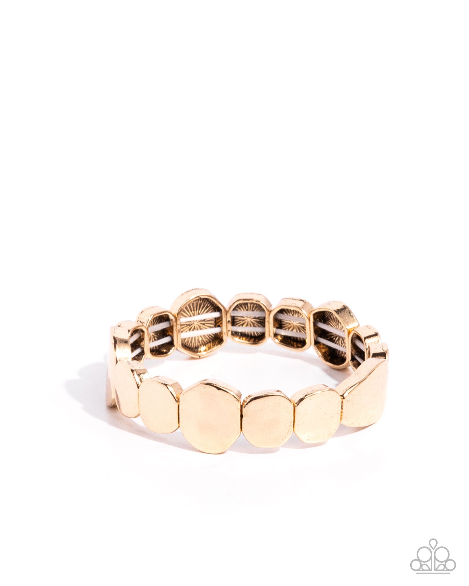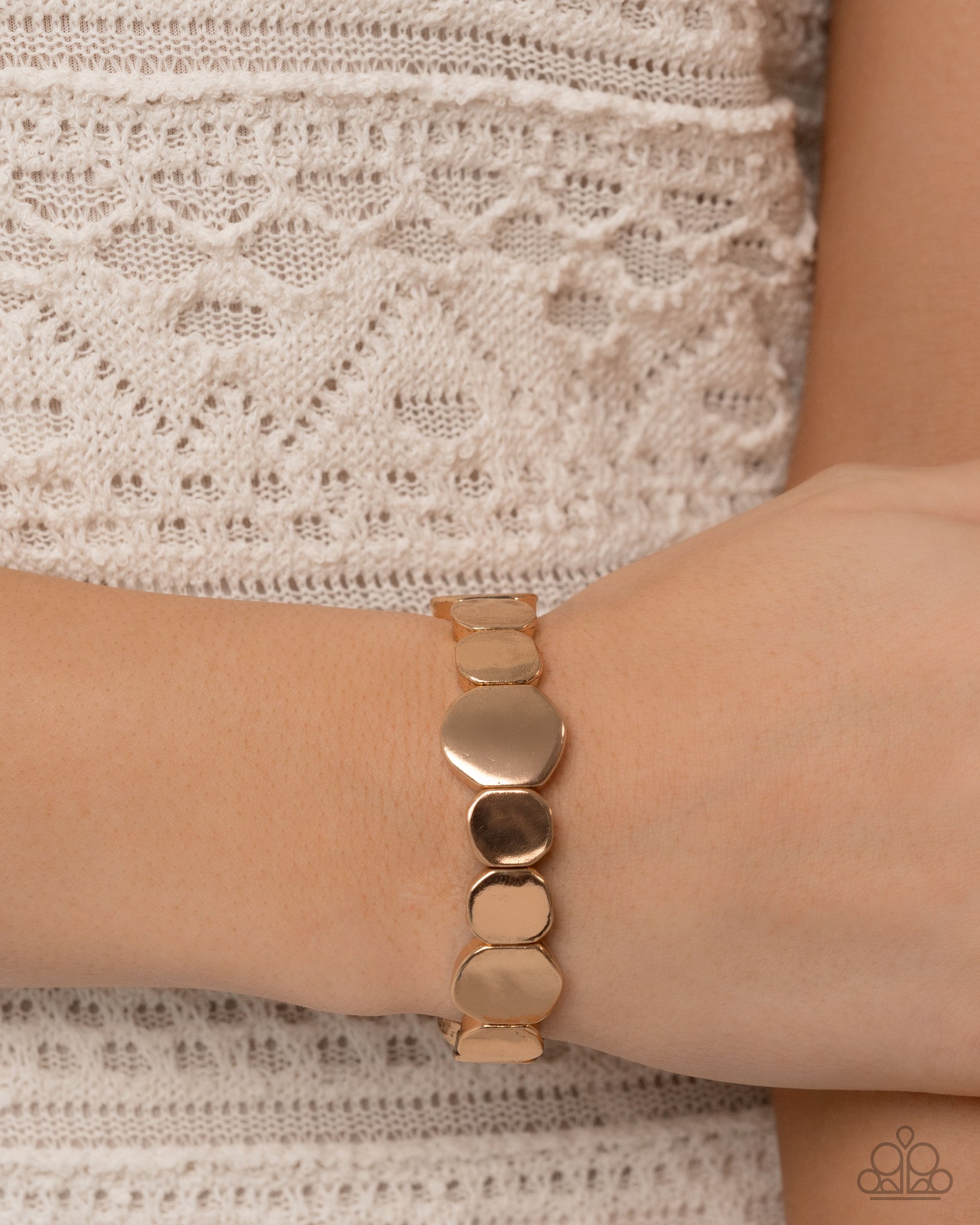 Delicately infused along an elastic stretchy band, a collection of varying sizes of gold abstract pebbles and pendants pattern around the wrist for a monochromatic mesmerizing display..