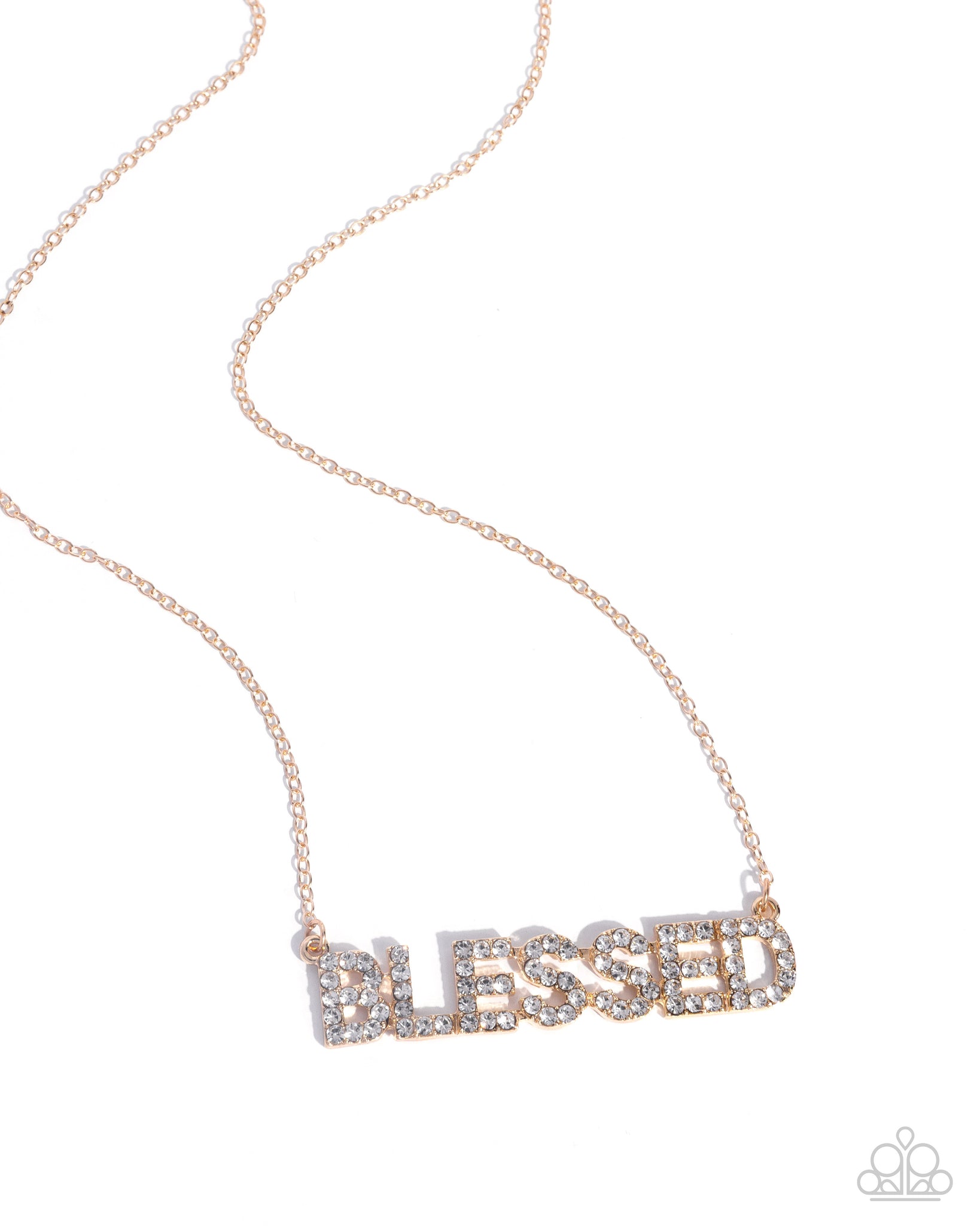 Dusted in dainty white rhinestones, oversized gold letters spell out the word "BLESSED" below the neckline for an iconic, inspirational look. Features an adjustable clasp closure.