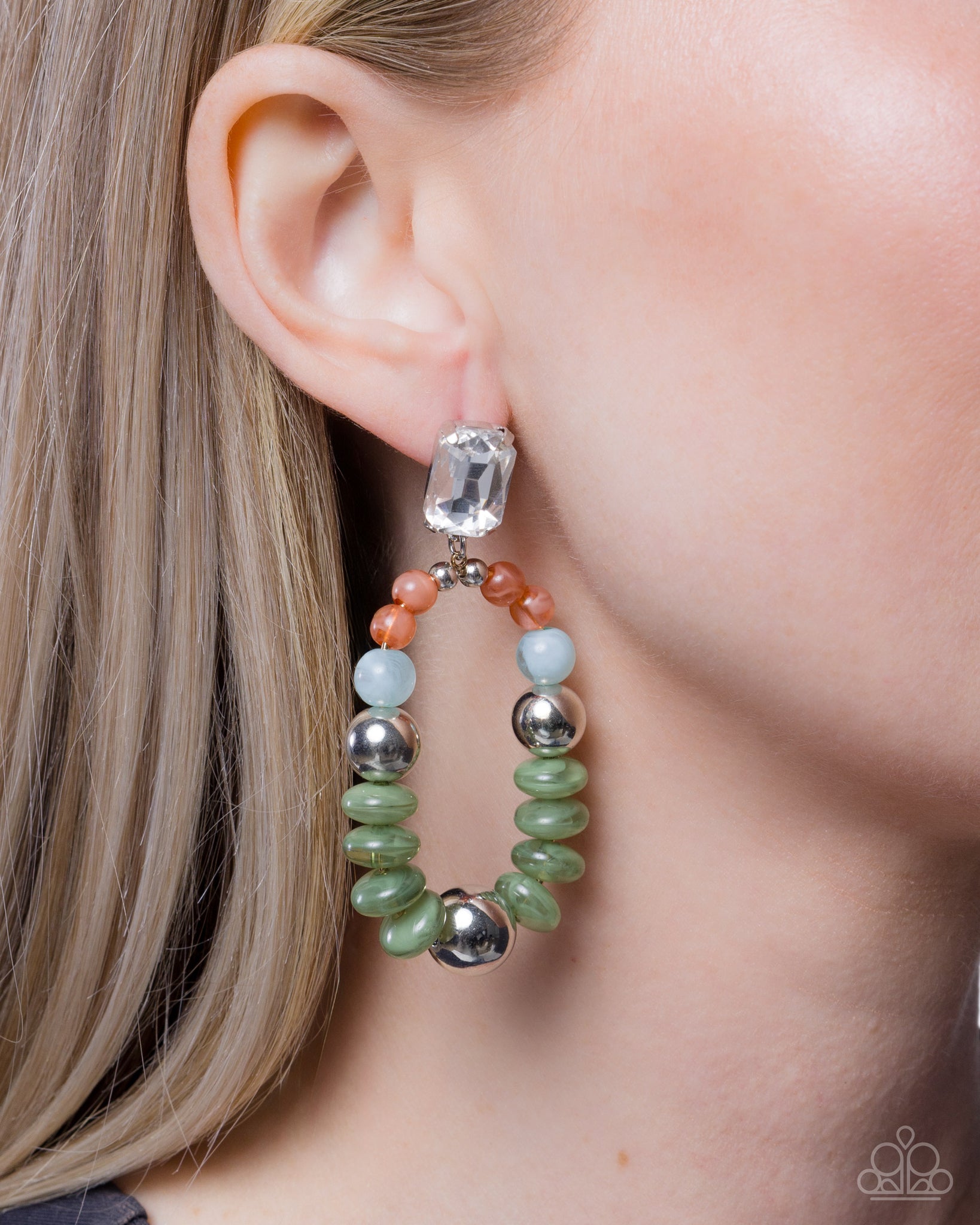Pronged in silver fittings, a faceted emerald-cut white gem shimmers atop the ear, giving way to a gold hoop infused with milky Kashmir, Limpet Shell, and Bran beads in varying sizes, and a collection of silver beads in varying sizes for a polished, patterned lure. Earring attaches to a standard post fitting.