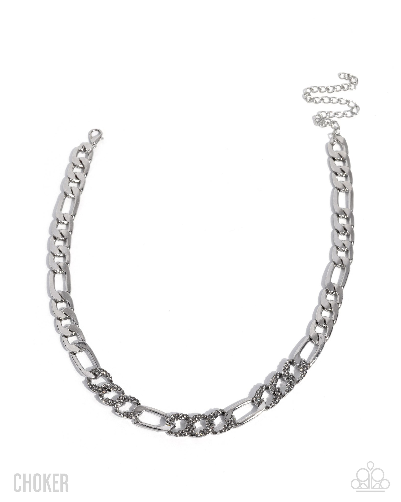 Featuring a mismatched arrangement, trio sections of silver curb chain links, some embellished in white rhinestones, join elongated silver links that connect across the chest, creating an iconic industrial display. Features an adjustable clasp closure.