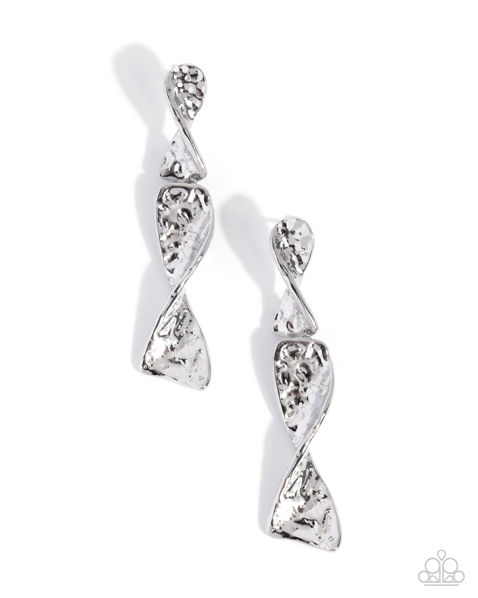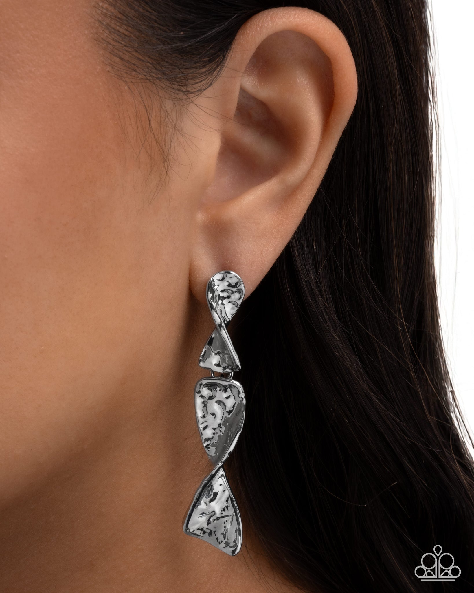 Featuring a hammered finish, a duo of mobius strip-inspired silver accents in varying sizes interconnect below the ear for an adorably abstract lure. Earring attaches to a standard post fitting.
