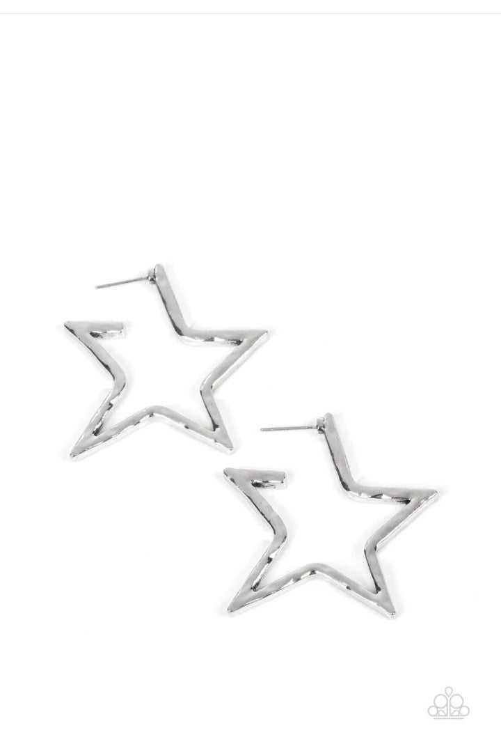A hammered silver bar delicately folds into a star-shaped hoop, resulting in a stellar metallic shimmer. Earring attaches to a standard post fitting.