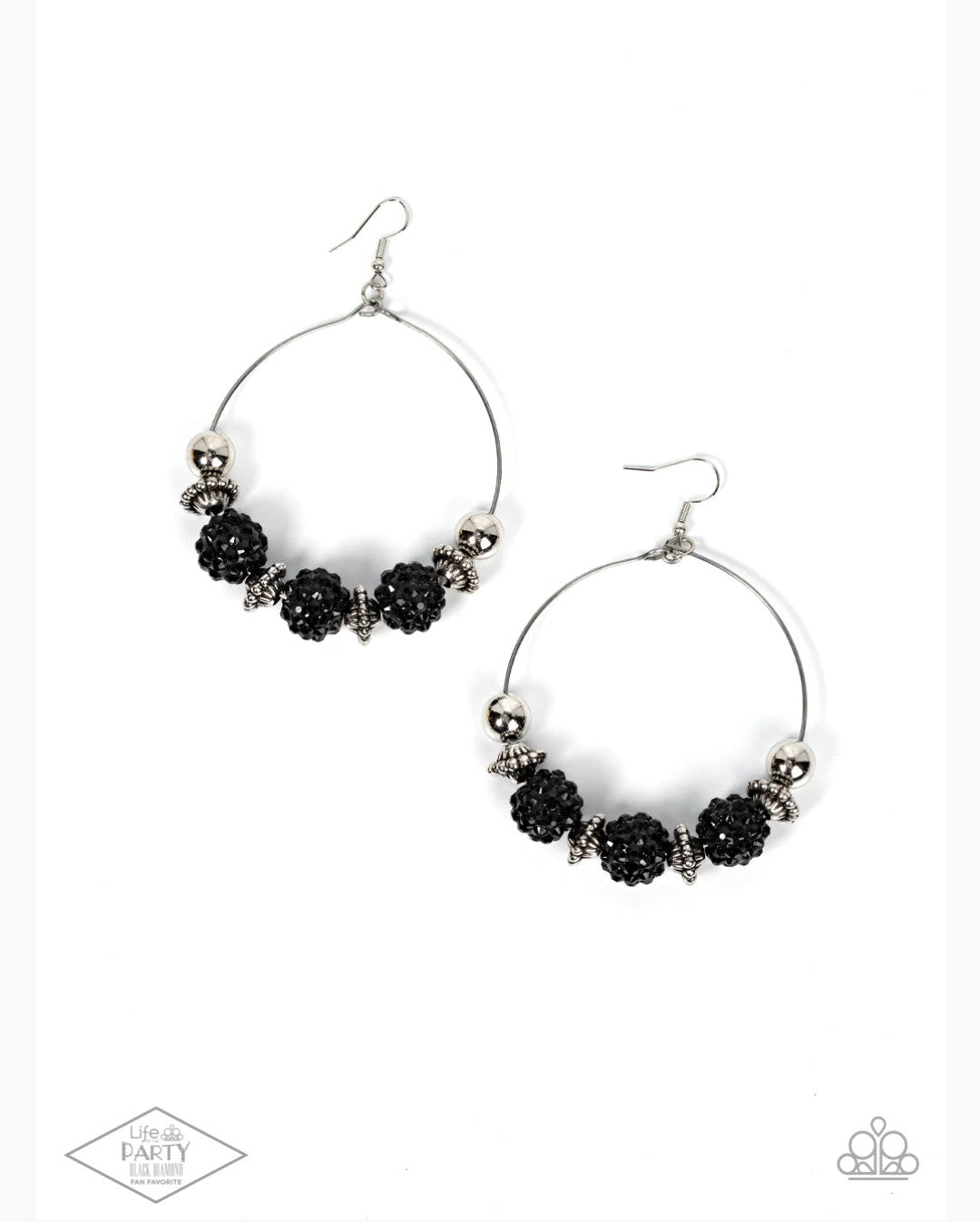 A stunning array of studded silver accents, oversized silver beads, and black rhinestone encrusted beads are threaded along a dainty silver wire hoop, resulting in a dazzling pop of color. Earring attaches to a standard fishhook fitting.