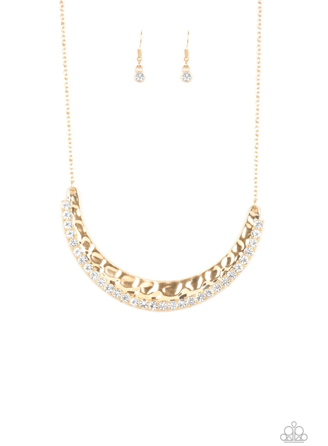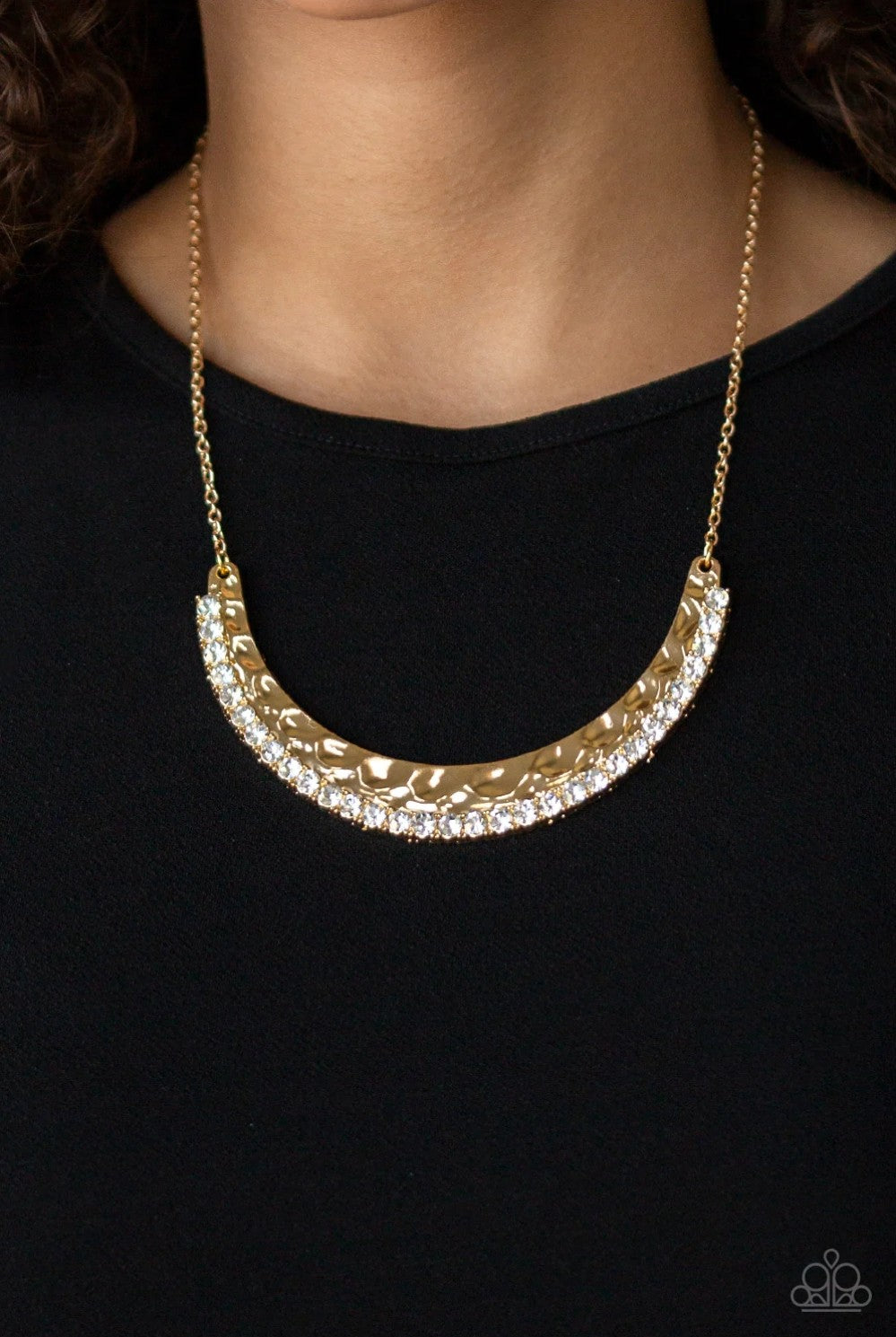 Featuring a shimmery hammered finish, the bottom of a glistening gold half-moon plate is encrusted in a dramatic row of glassy white rhinestones, creating a blinding statement piece below the collar. Features an adjustable clasp closure.