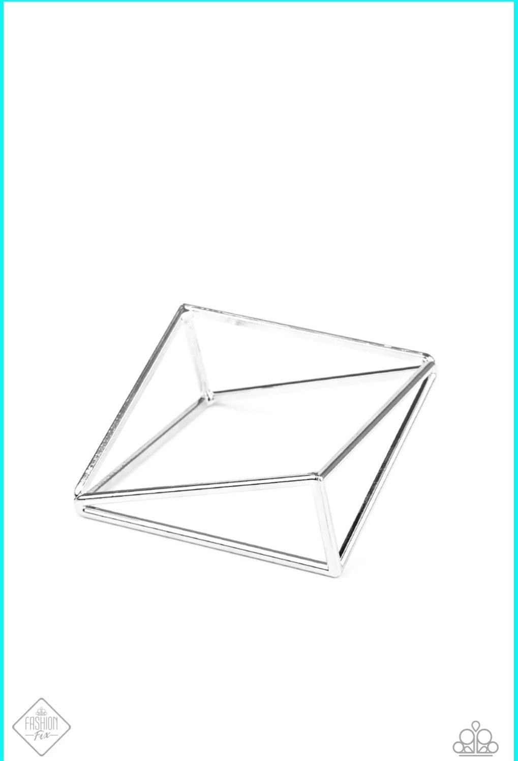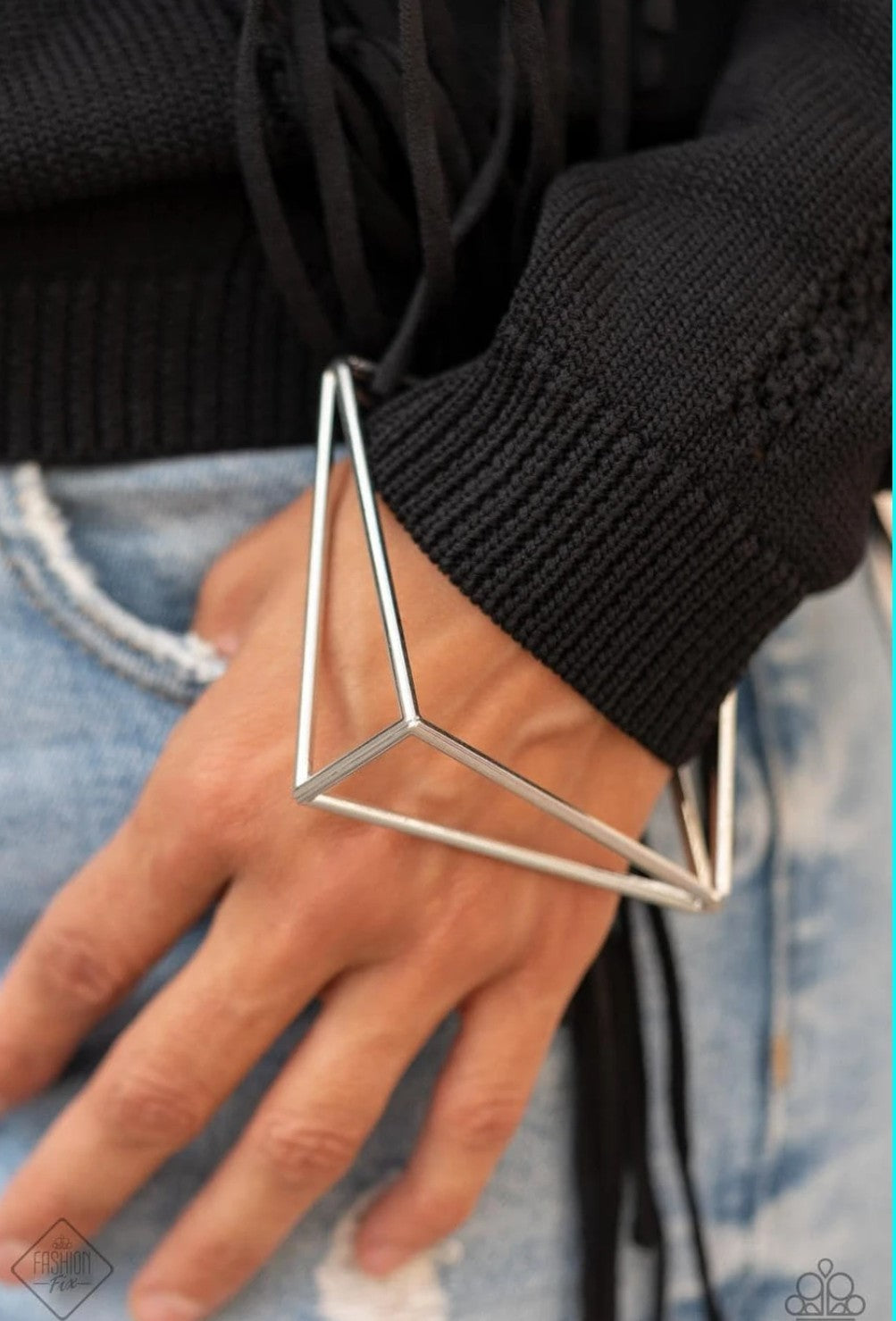 Exaggerated silver triangle frames connect at their edges to create a geometric bangle with three-dimensional drama.