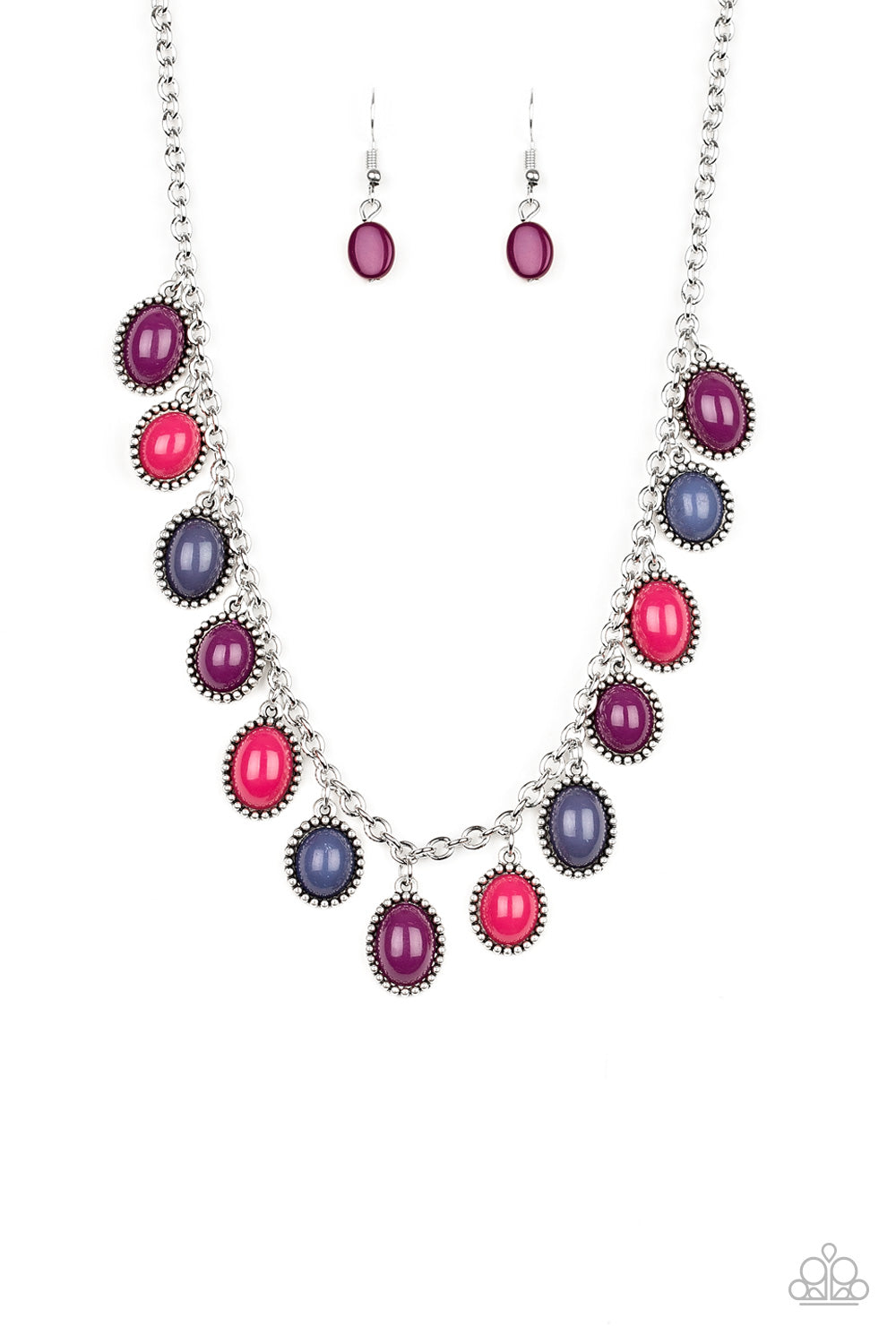 Infused with studded silver frames, round and oval multicolored beads swing from a shimmery silver chain, creating a vivacious fringe below the collar. Features an adjustable clasp closure.