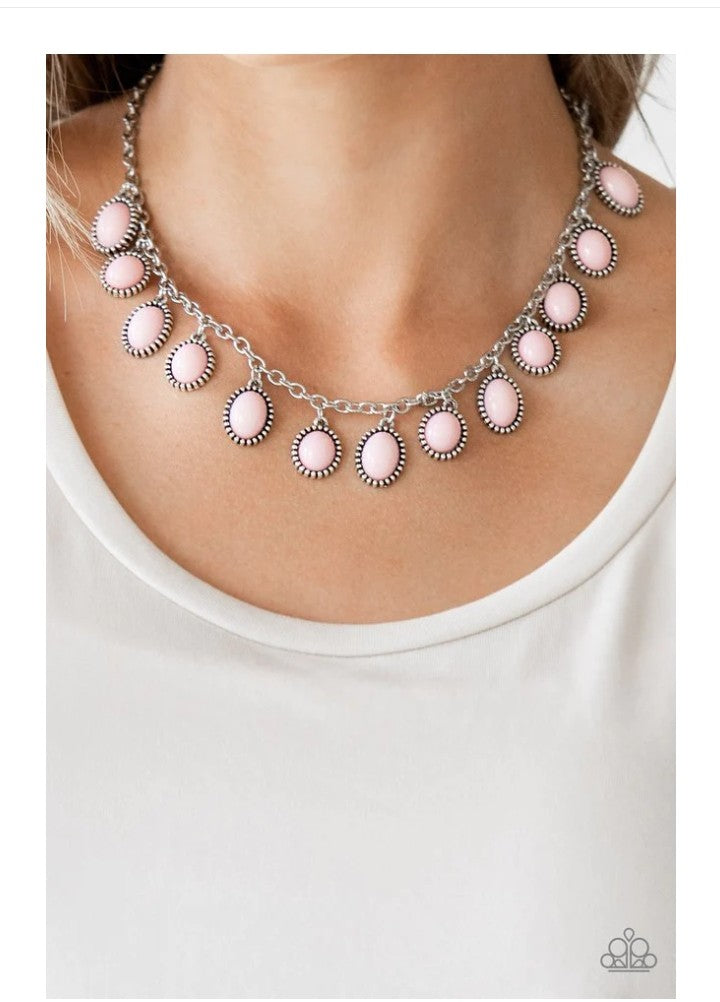 Infused with studded silver frames, round and oval pink beads swing from a shimmery silver chain, creating a colorful fringe below the collar. Features an adjustable clasp closure.