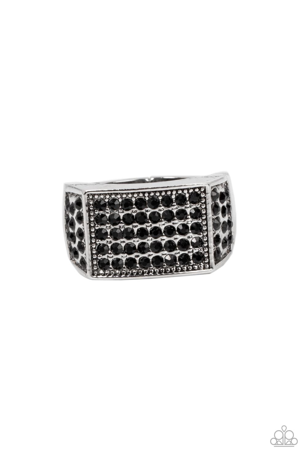 The front of a rectangular silver frame is encrusted in sections of black rhinestones, resulting in a smoldering centerpiece atop the finger. Features a stretchy band for a flexible fit.