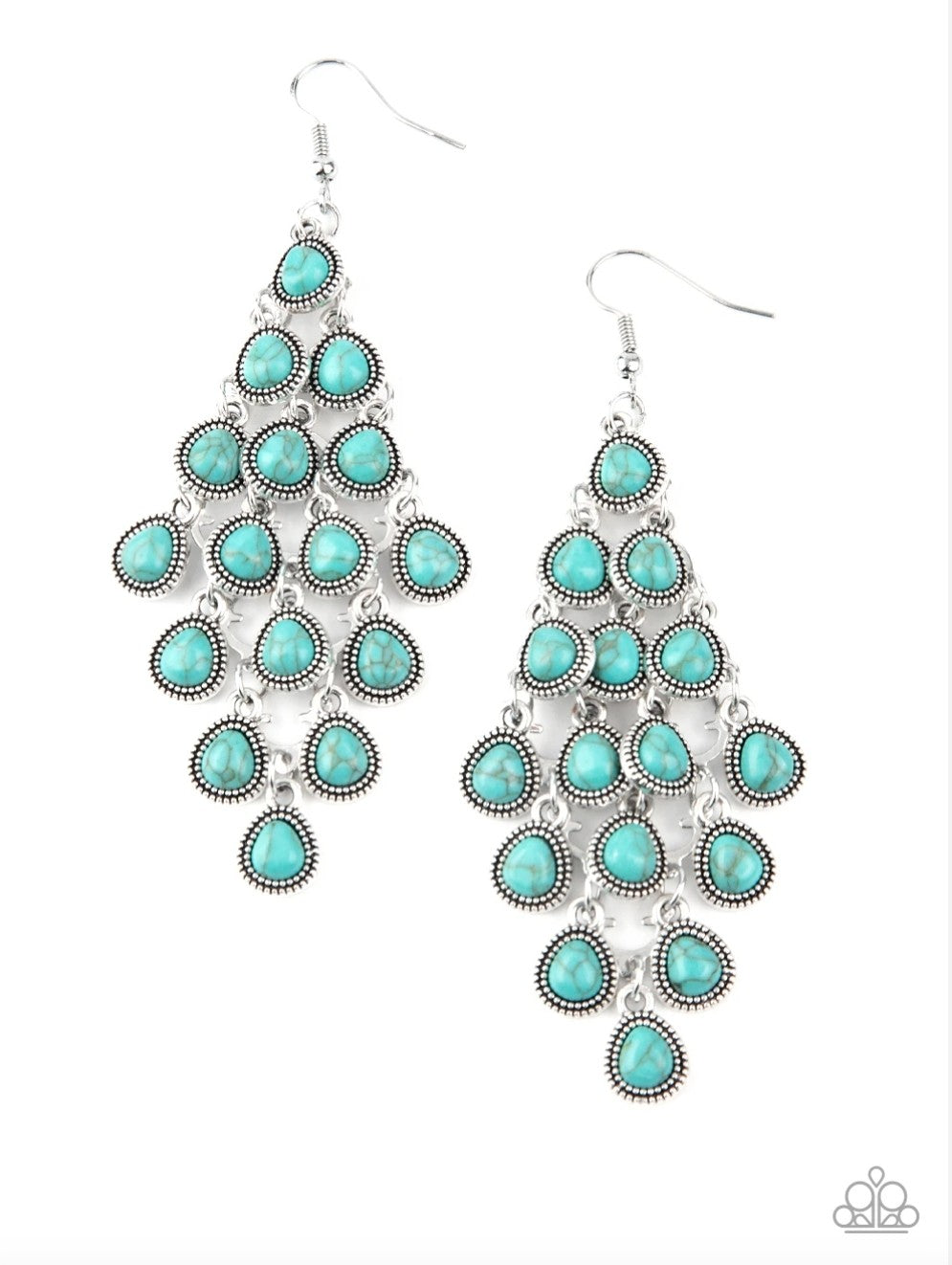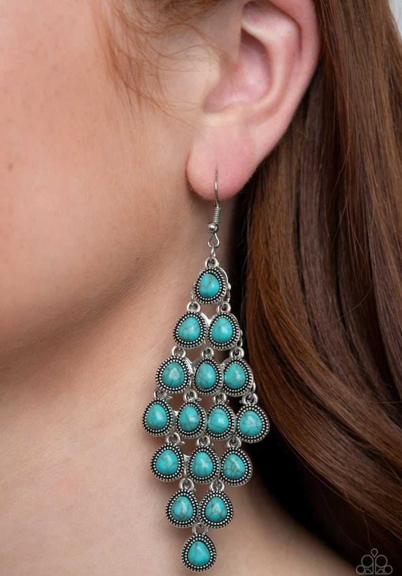 Featuring studded silver frames, dainty turquoise stone teardrops cascade from the ear. The earthy frames dangle from a netted backdrop, coalescing into a rustic lure. Earring attaches to a standard fishhook fitting.