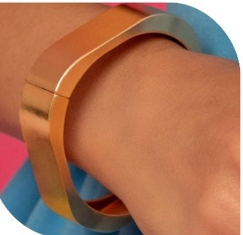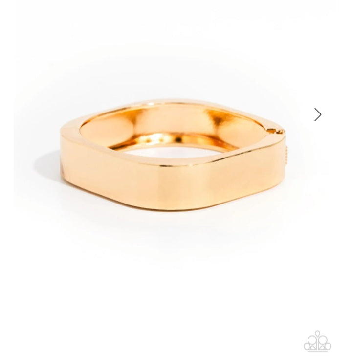 Featuring a sleek, high-sheen finish, a thick gold cuff asymmetrically wraps around the wrist, creating a tilted square centerpiece for a monochromatic staple. Features a hinged closure.